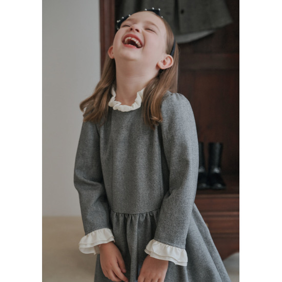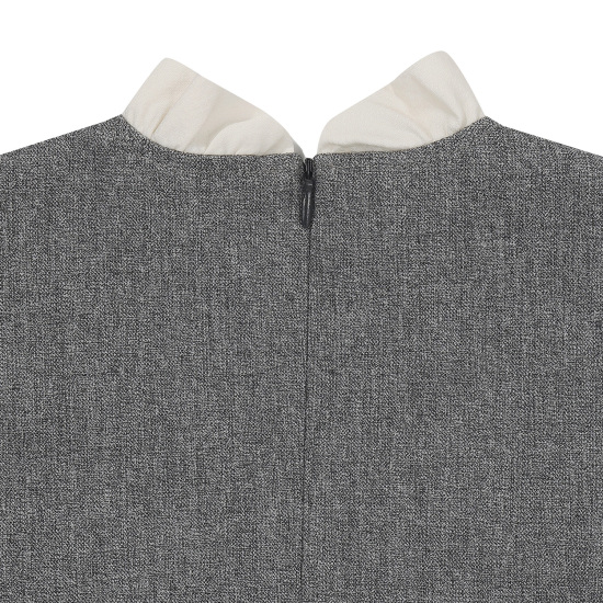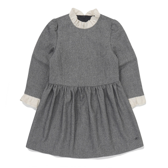 고급스러운 투톤 그레이 컬러의 원피스입니다. 유니크한 소재를 사용하여 스커트의 풍부한 셔링이 부담스럽지 않으며 다양한 체형을 커버해 줄 수 있는 실루엣이 세련된 디자인입니다. 사랑스러운 카라 러플과 손매끝의 배색이 포인트로 화사한 이미지를 더해줍니다.