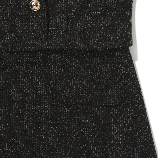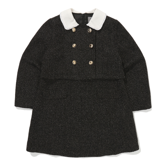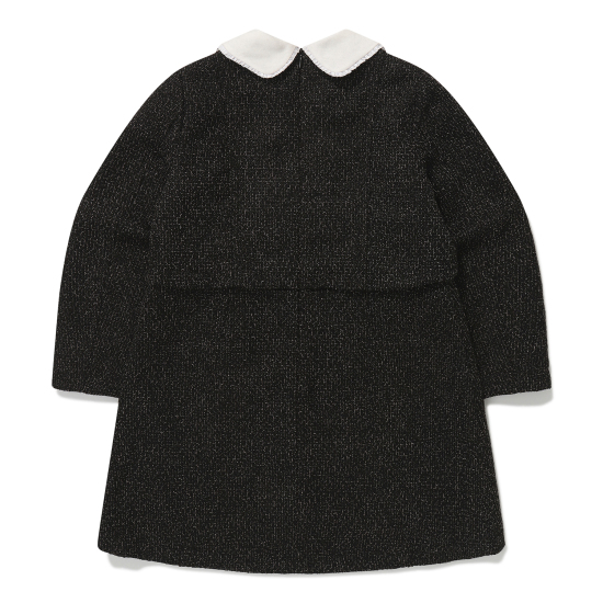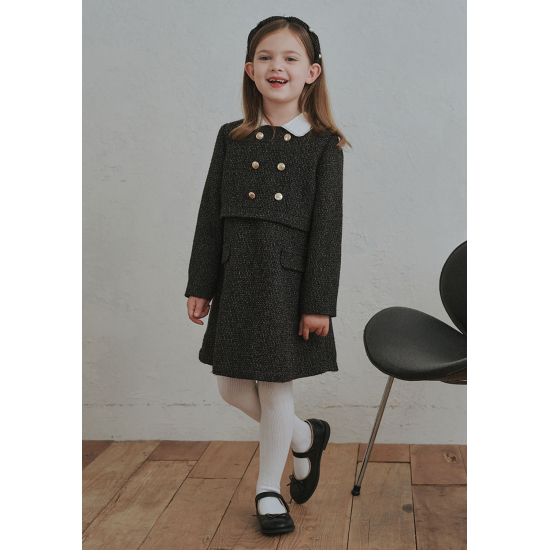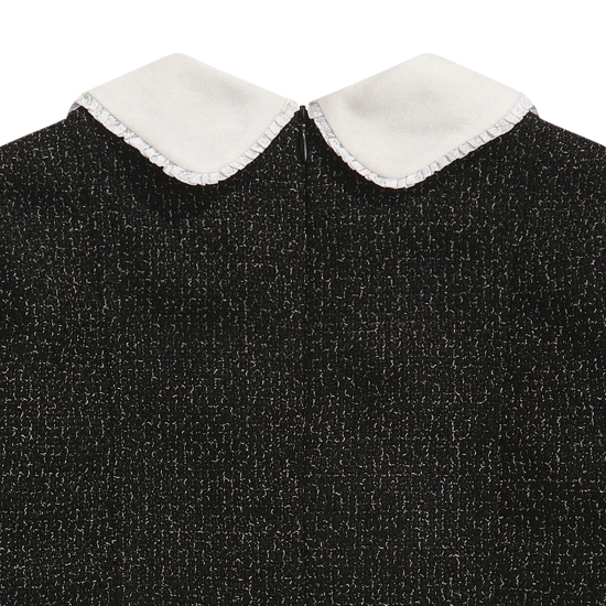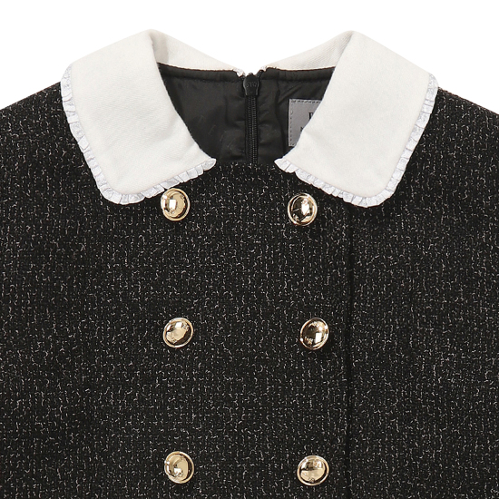 고급스러운 블랙 트위드 소재의 원피스입니다. 자켓과 스커트 셋업을 입은 레이어드 디자인으로 세련된 분위기를 보여주는 아이템입니다. 화이트 컬러의 카라와 골드 컬러 단추가 고급스러운 디테일로 깔끔한 타운의 스타일링을 보여줍니다.