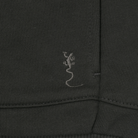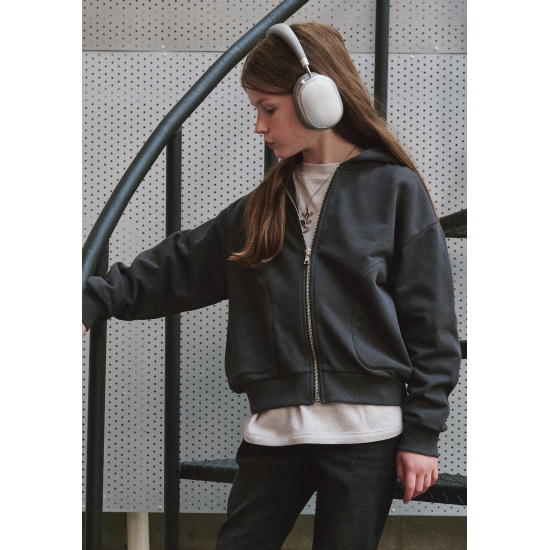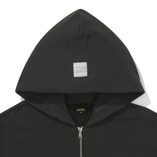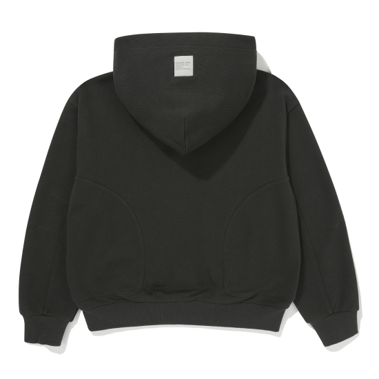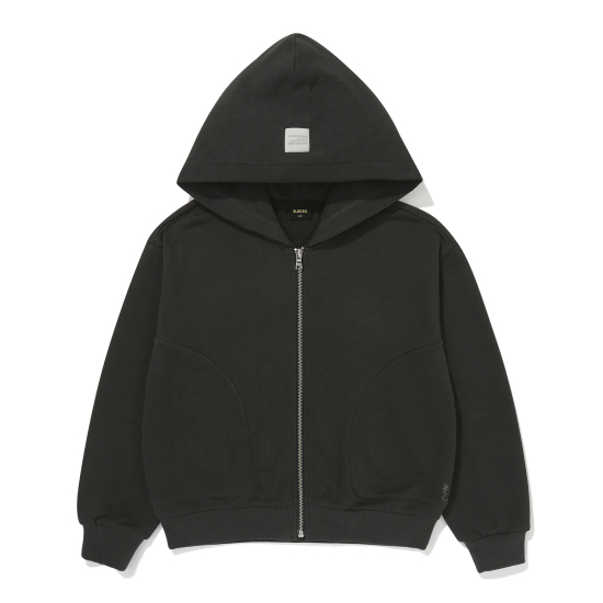 힙하고 트렌디하게 연출할 수 있는 크롭 후디 차콜그레이 집업점퍼입니다. 앞뒤로 라운딩된 절개로 포인트를 준 아이템입니다. 도마뱀 자수와 라벨로 컬러 포인트를 주었습니다.