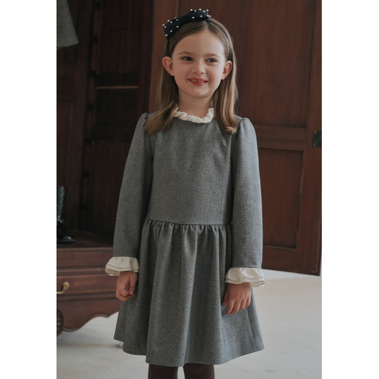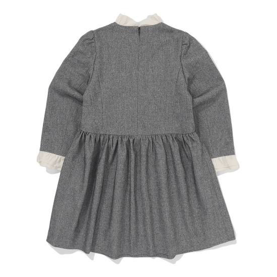 고급스러운 투톤 그레이 컬러의 원피스입니다. 유니크한 소재를 사용하여 스커트의 풍부한 셔링이 부담스럽지 않으며 다양한 체형을 커버해 줄 수 있는 실루엣이 세련된 디자인입니다. 사랑스러운 카라 러플과 손매끝의 배색이 포인트로 화사한 이미지를 더해줍니다.