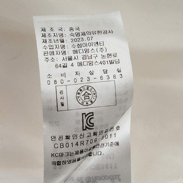 제품소재 : 겉감 폴리에스터 91 폴리우레탄 9배색 1 폴리에스터 100배색 2 지조직-나일론 100 자수 - 면