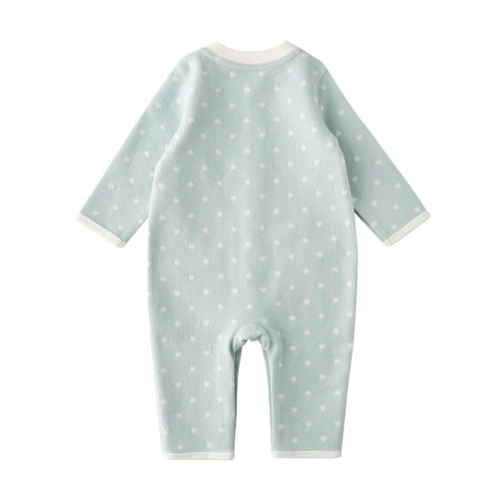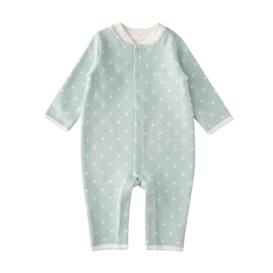 민트 컬러의 골지 저지 원단에 하트 모양의 자가드 조직을 더해 귀여운 무드를 구현하였습 니다.