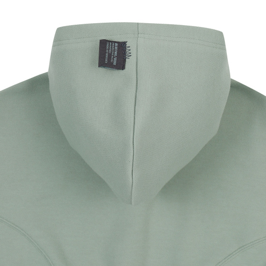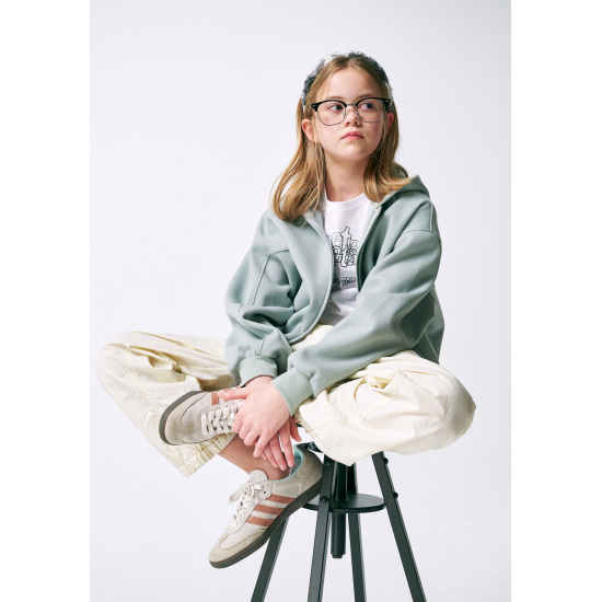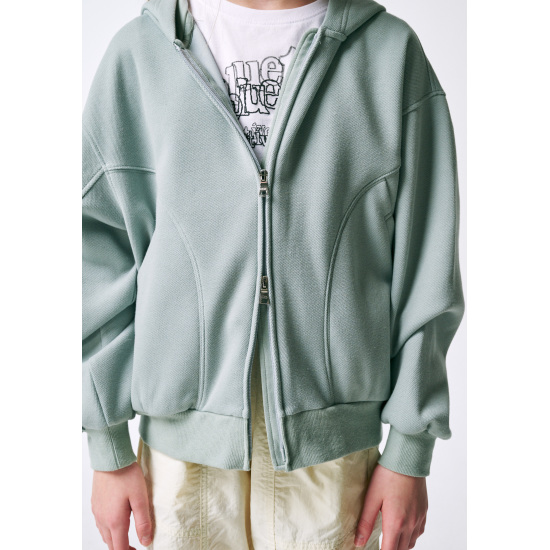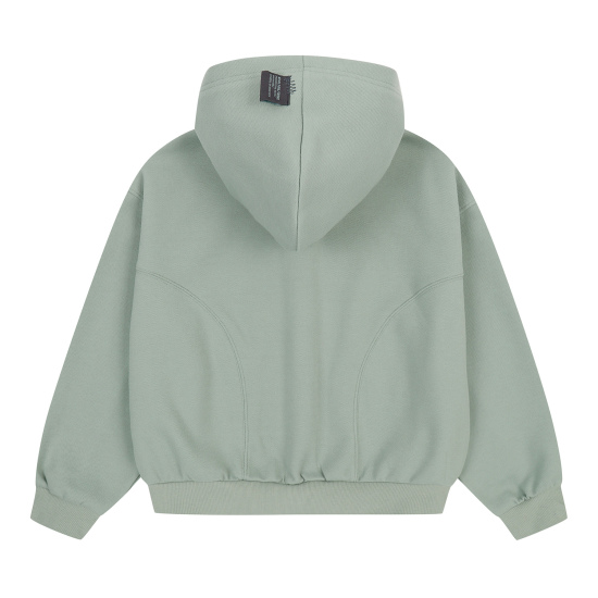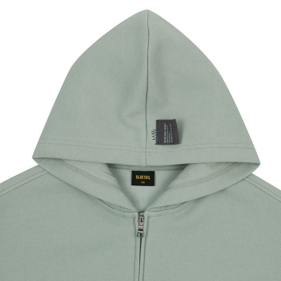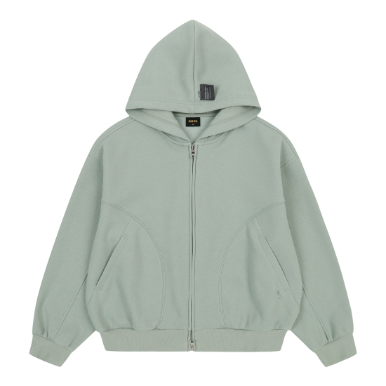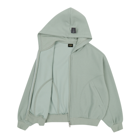 민트 컬러의 피케 원단으로 제안한 후드 집업 점퍼입니다. 몸판 앞뒤로 굴려진 절개선을 넣어 입었을 때 볼륨감 있게 제안하였고 소매 앞까지 연결된 절개를 넣어 입체 핏을 의도하였습니다. 투웨이 지퍼를 사용해 밑을 오픈해서 스타일링할 수 있습니다. 속플랑켓과 후드안감은 싱글원단을 사용해 가벼우면서 지퍼 쓸림을 방지하였습니다.
