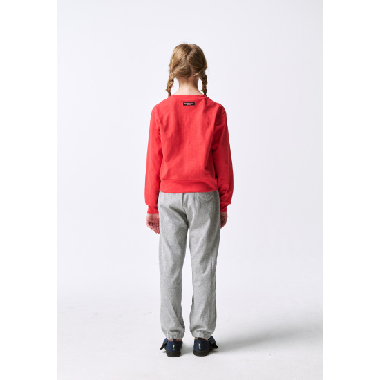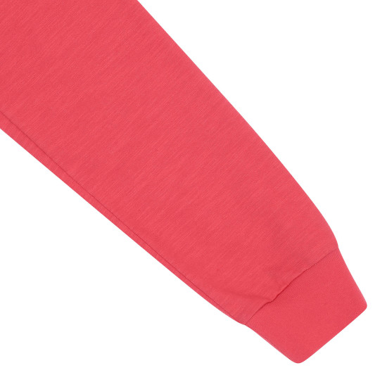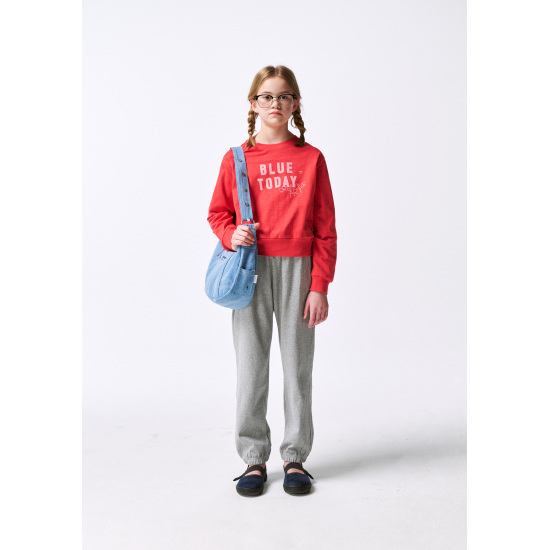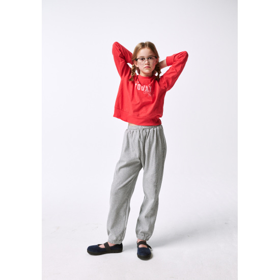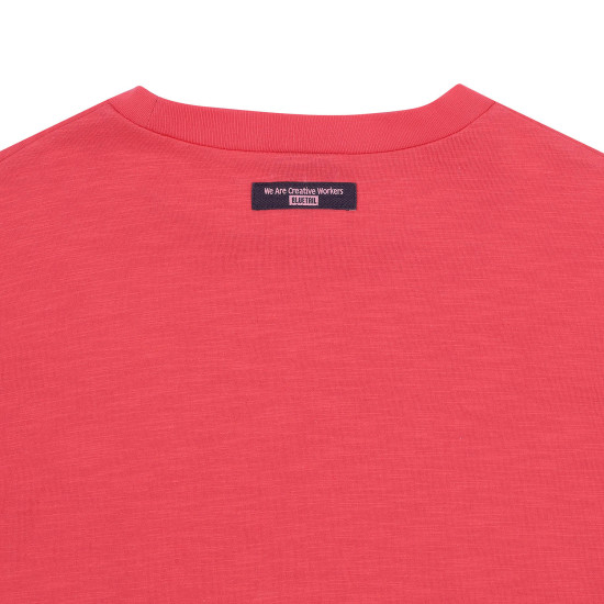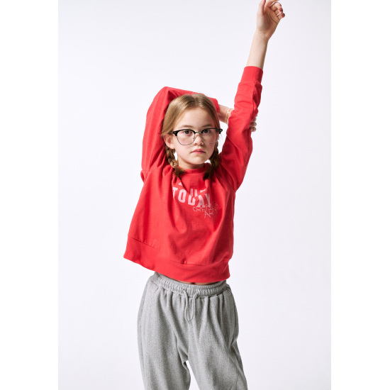 선명한 레드 컬러가 매력적인 핏한 스웻 셔츠입니다. 살짝 슬림한 상동에 크롭 기장으로 제안하였습니다. 앞판에 빈티지한 레터링과 도마뱀 포인트를 스미듯이 오가닉한 아이보리 컬러로 제안하였습니다.