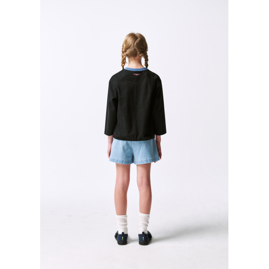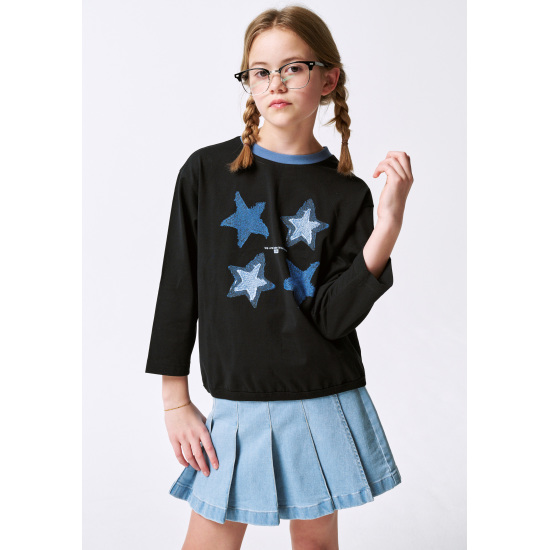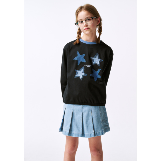 시크한 블랙 컬러 스포티 티셔츠입니다. 넉넉한 상동에 살짝 힙을 덮는 기장으로 제안하였습니다. 9부 소매 기장으로 스포티한 느낌을 살려주었습니다. 앞쪽에는 인디고 데님으로 패치한 듯한 별 나염을 투톤 컬러로 포인트를 주었고 빈티지한 기법으로 표현하였습니다.