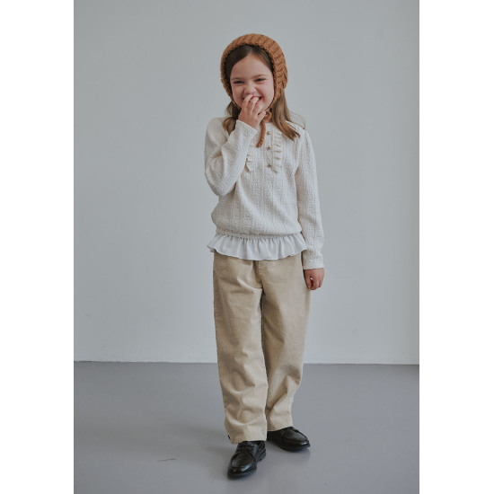 프릴 장식이 달려 여성스러운 라인으로 스타일링에 포인트를 줄 수 있는 아이보리 컬러의 여아 티 블라우스입니다. 넥 부분에 프릴 장식 디테일과 흑골드 단추 장식이 포인트가 되어 고급스럽고 사랑스러운 분위기를 더해줍니다. 밑단 부분에 화이트 컬러의 프릴을 배색하여 여아 블랙 자켓과 함께 매치했을 때 살짝 보이는 밑단이 여성스러운 분위기를 더해주어 세련된 여아 스타일링을 제안할 수 있습니다.
