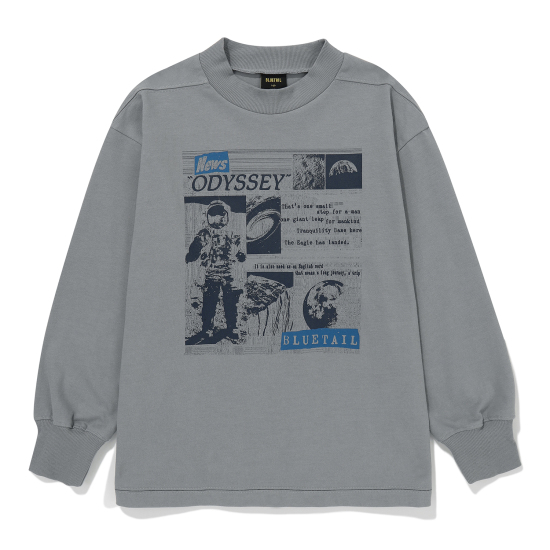 유니크한 그레이 컬러 기모 티셔츠입니다. 상동과 어깨가 넓지 않은 세미 슬림핏으로 제안하여 레이어드에도 용이한 아이템입니다. 살짝 올라온 넥으로 제안하여 따뜻하게 감싸며 답답하지않게 제안했습니다. 앞판에 오디세이와 우주에 관련된 뉴스 나염을 빈티지한 기법으로 표현하여 컬러 포인트를 주었습니다.