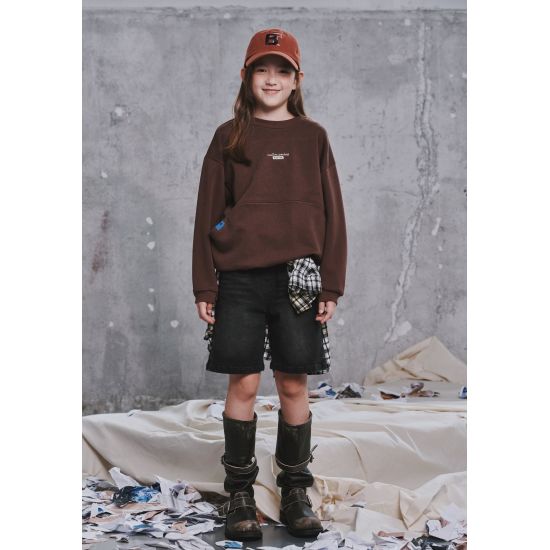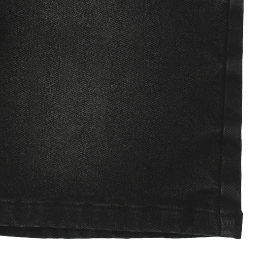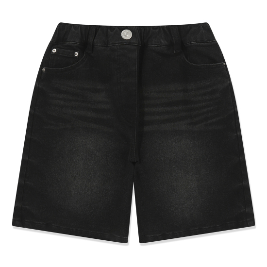 무릎 기장의 블랙 데님 반바지입니다. 사이드에 들어간 도밍고 워싱과 실버 컬러의 리벳 디테일을 더해 블랙 원단과 대비되어 유니크하고 트렌디하게 제안한 상품입니다.