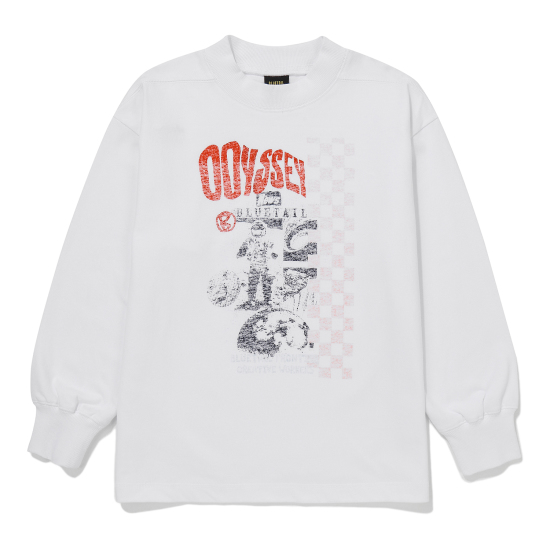 클린한 화이트 컬러 기모 티셔츠입니다. 상동과 어깨가 넓지 않은 세미 슬림핏으로 제안하여 레이어드에도 용이한 아이템입니다. 살짝 올라온 넥으로 제안하여 따뜻하게 감싸며 답답하지 않게 제안했습니다.앞판에 오디세이와 우주에 관련된 뉴스 나염을 빈티지하면서도 감각적인 윈터 파스텔 컬러로 표현하였습니다.