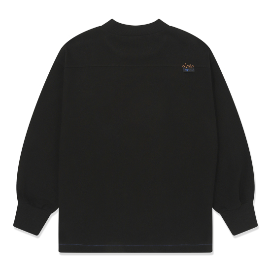 시크한 블랙 컬러 기모 티셔츠입니다. 상동과 어깨가 넓지 않은 세미 슬림핏으로 제안하여 레이어드에도 용이한 아이템입니다. 살짝 올라온 넥으로 제안하여 따뜻하게 감싸며 답답하지 않게 제안했습니다. 밑단에 블루 컬러 스티치로 포인트를 주었습니다. 스트릿 감성을 살려 임팩트 있는 빈티지한 레터링나염으로 컬러 포인트를 주었습니다.