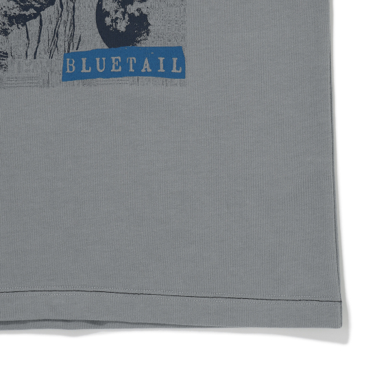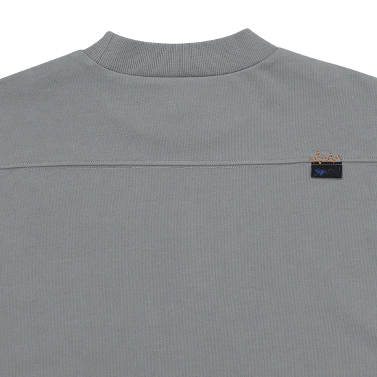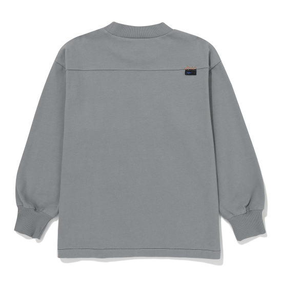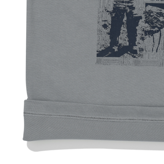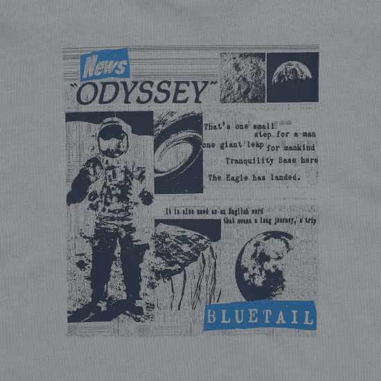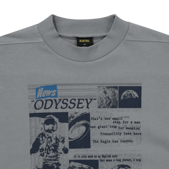 유니크한 그레이 컬러 기모 티셔츠입니다. 상동과 어깨가 넓지 않은 세미 슬림핏으로 제안하여 레이어드에도 용이한 아이템입니다. 살짝 올라온 넥으로 제안하여 따뜻하게 감싸며 답답하지않게 제안했습니다. 앞판에 오디세이와 우주에 관련된 뉴스 나염을 빈티지한 기법으로 표현하여 컬러 포인트를 주었습니다.