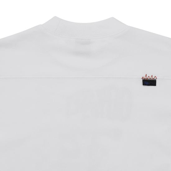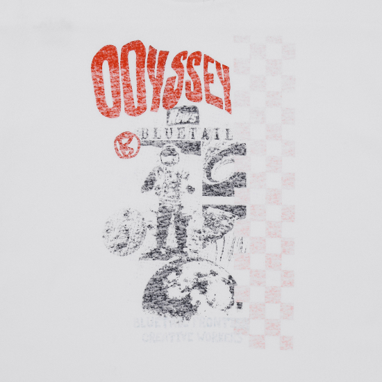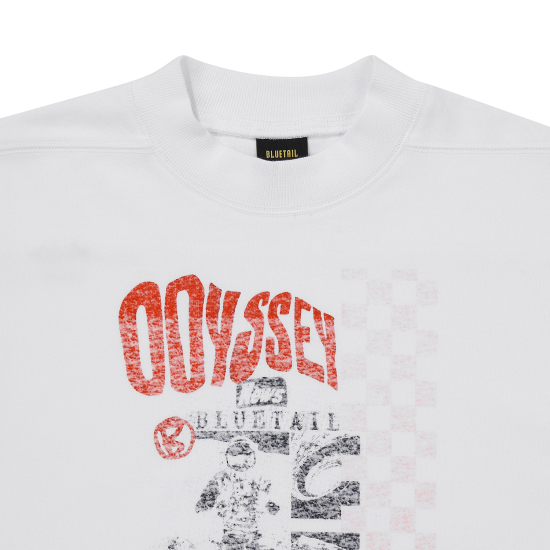 클린한 화이트 컬러 기모 티셔츠입니다. 상동과 어깨가 넓지 않은 세미 슬림핏으로 제안하여 레이어드에도 용이한 아이템입니다. 살짝 올라온 넥으로 제안하여 따뜻하게 감싸며 답답하지 않게 제안했습니다.앞판에 오디세이와 우주에 관련된 뉴스 나염을 빈티지하면서도 감각적인 윈터 파스텔 컬러로 표현하였습니다.