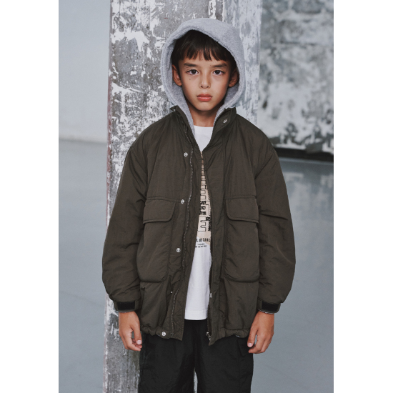 고시감 있는 나일론 겉원단에 플리스 안감으로 높은 보온성과 양면으로 입을 수 있는 리버시블 카키 화섬 점퍼입니다. 아웃도어스러운 느낌으로 세련된 고프코어룩을 연출할 수 있습니다. 겉쪽 화섬은 야상을 미니멀하게 해석한 시크함이 돋보이고, 안쪽 플리스는 포근함을 살려 미니멀하게 제안하였습니다. 힙을 넉넉하게 덮는 기장에 밑단과 허리 안 엘라스트링으로 프로텍티브한 핏을 연출할 수 있습니다. 세련된 가죽 라벨과 레터링 자수로 컬러 포인트를 주었습니다.