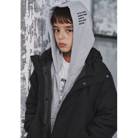 고시감 있는 나일론 겉원단에 플리스 안감으로 높은 보온성과 양면으로 입을 수 있는 리버시블 블랙 화섬 점퍼입니다. 아웃도어스러운 느낌으로 세련된 고프코어룩을 연출할 수 있습니다. 겉쪽 화섬은 야상을 미니멀하게 해석한 시크함이 돋보이고, 안쪽 플리스는 포근함을 살려 미니멀하게 제안하였습니다. 힙을 넉넉하게 덮는 기장에 밑단과 허리 안 엘라스트링으로 프로텍티브한 핏을 연출할 수 있습니다. 세련된 가죽 라벨과 레터링 자수로 컬러 포인트를 주었습니다.