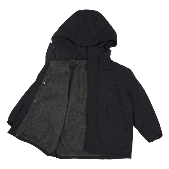 고시감 있는 나일론 겉원단에 플리스 안감으로 높은 보온성과 양면으로 입을 수 있는 리버시블 블랙 화섬 점퍼입니다. 아웃도어스러운 느낌으로 세련된 고프코어룩을 연출할 수 있습니다. 겉쪽 화섬은 야상을 미니멀하게 해석한 시크함이 돋보이고, 안쪽 플리스는 포근함을 살려 미니멀하게 제안하였습니다. 힙을 넉넉하게 덮는 기장에 밑단과 허리 안 엘라스트링으로 프로텍티브한 핏을 연출할 수 있습니다. 세련된 가죽 라벨과 레터링 자수로 컬러 포인트를 주었습니다.