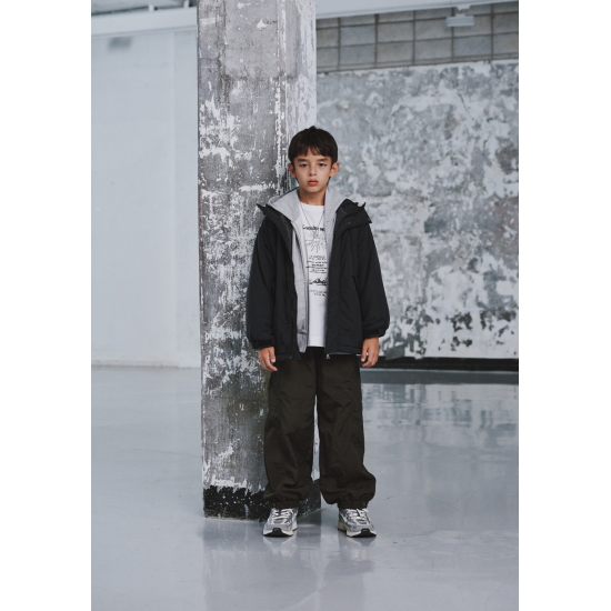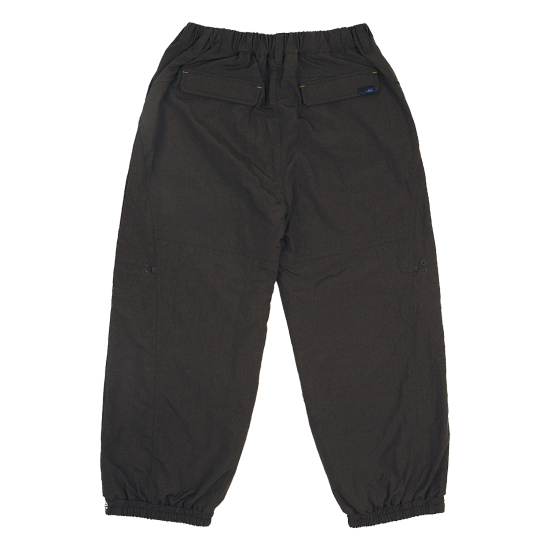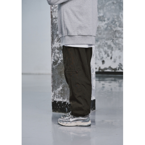 고시감 있는 나일론 겉원단에 기모 안감을 넣은 카키 컬러 아웃도어 화섬 팬츠입니다. 힙한 무드의 와이드 조거핏으로 제안하였고 전체 통고무줄로 편안하게 착용할 수 있습니다. 바지 앞뒤로 곡선 절개가 있어 볼륨감 있는 간지를 연출하기 좋습니다. 라벨과 나염으로 컬러 포인트를 주었습니다.