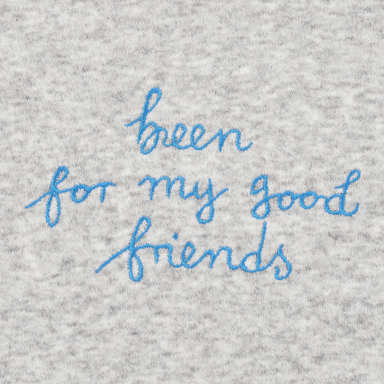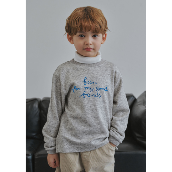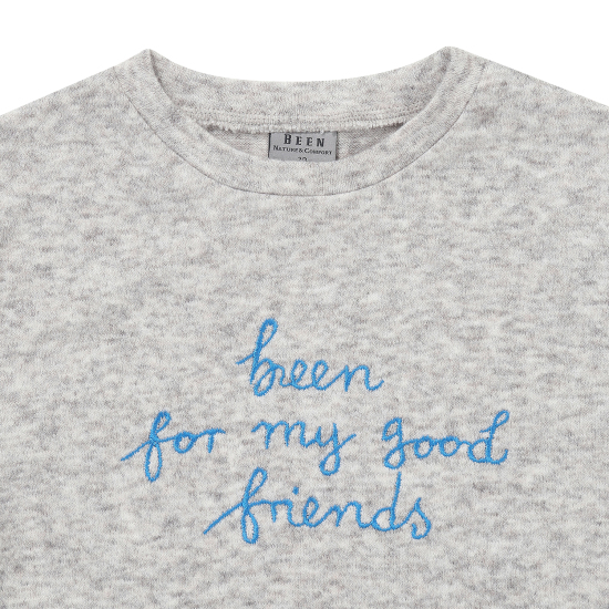 따뜻하면서도 내추럴한 컬러감이 돋보이는 멜란지 컬러의 라운드 티셔츠입니다. 앞판의 선명한 블루 컬러의 자수 포인트가 빈의 좋은 친구라는 의미로 고급스러운 포인트를 더해주었습니다. 아이보리 퀼팅 점퍼와 베이지 컬러의 코듀로이 팬츠와 함께 매치하여 세련된 컬러감의 빈의 타운 캐주얼 스타일링을 연출할 수 있습니다.