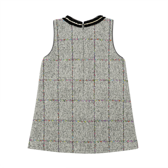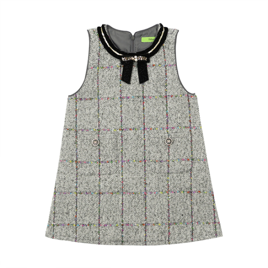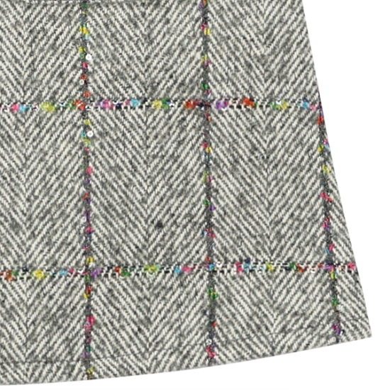 상품설명-그레이 계열 헤링본 체크에 멀티 스팽글이 은은하게 포인트를 주는 소재의 JP/SK입니다. 넥라인에 벨벳 스팽글 프릴 TAPE 장식과 블랙 리본 브롯치로 포인트를 준 스타일입니다. 핸드메이드 자켓이나 크롭 오리털 점퍼에 코디해도 고급스럽게 연출 가능한 스타일입니다.