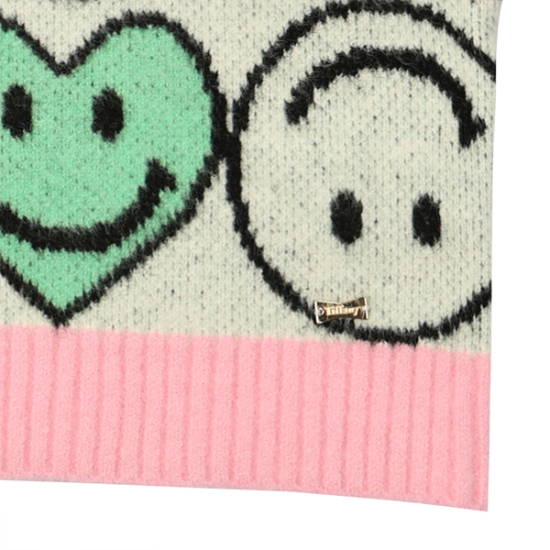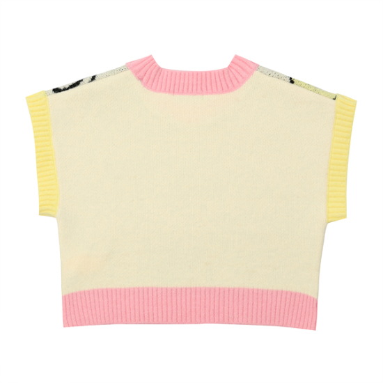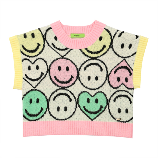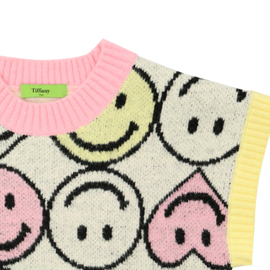 상세설명-앞쪽에 스마일 자카드를 멀티 컬러로 한 니트 베스트 스타일입니다. 레이어드 용으로 드랍 어깨 스타일과 크롭 라인으로 편하게 레이어링이 가능하도록 한 니트입니다.