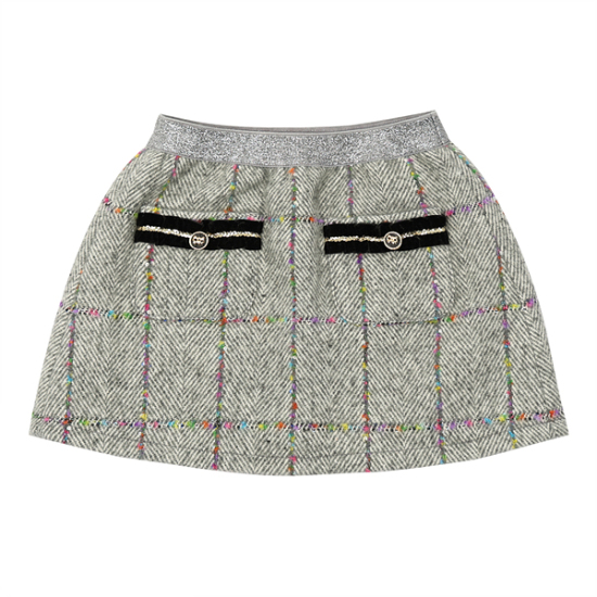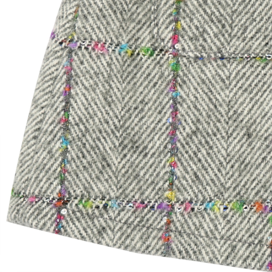 상세설명-그레이 계열 헤링본 체크에 멀티 스팽글이 은은하게 포인트를 주는 소재의 스커트로 앞포켓에 벨벳 스팽글 프릴 TAPE 장식으로 포인트를 준 스타일입니다. 핸드메이드 자켓이나 크롭 오리털 점퍼에 코디해도 고급스럽게 연출 가능한 스타일입니다.