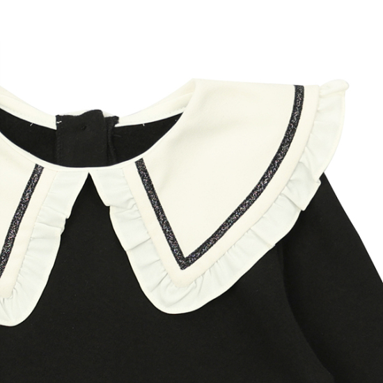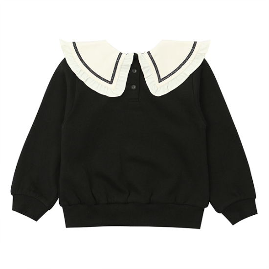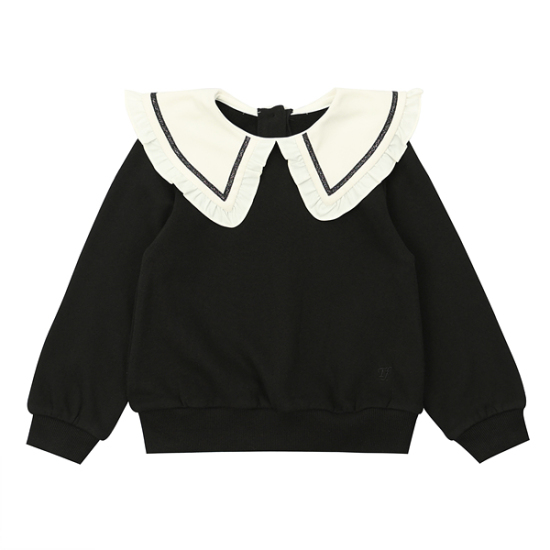 상세설명-기모쭈리 맨투맨 스타일에 빅 프릴 카라가 달린 티셔츠입니다. 깔끔한 스타일로 모직 스커트와 코디하여 연출하기 좋은 스타일입니다.