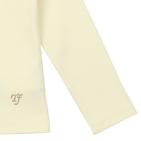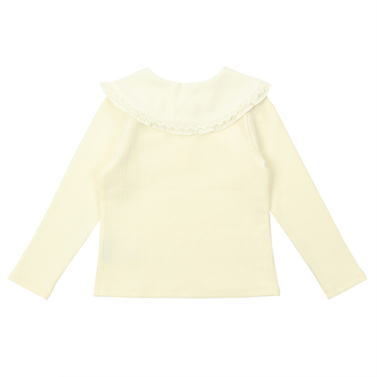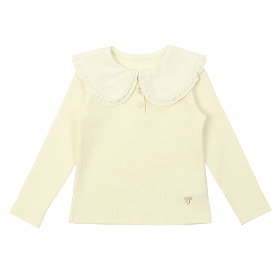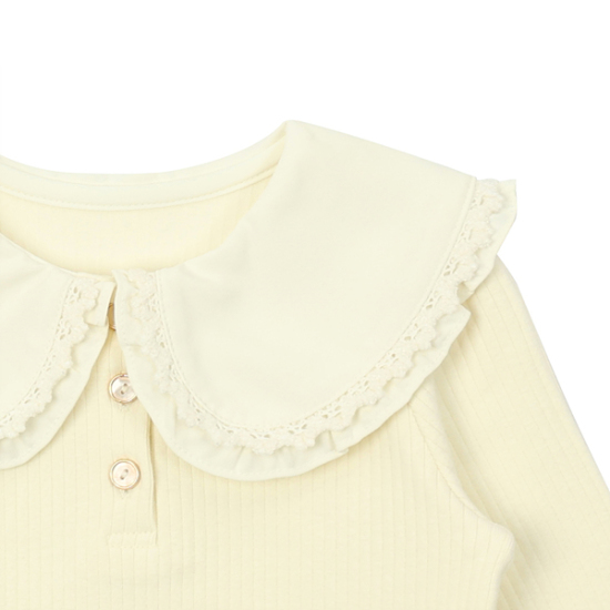 상세설명-기모 골지 소재에 우븐 빅카라를 매칭시킨 티셔츠입니다. 카라와 프릴단 사이에 레이스를 끼워 포인트를 준 스타일로 이너용으로 코디하기 좋은 스타일입니다.