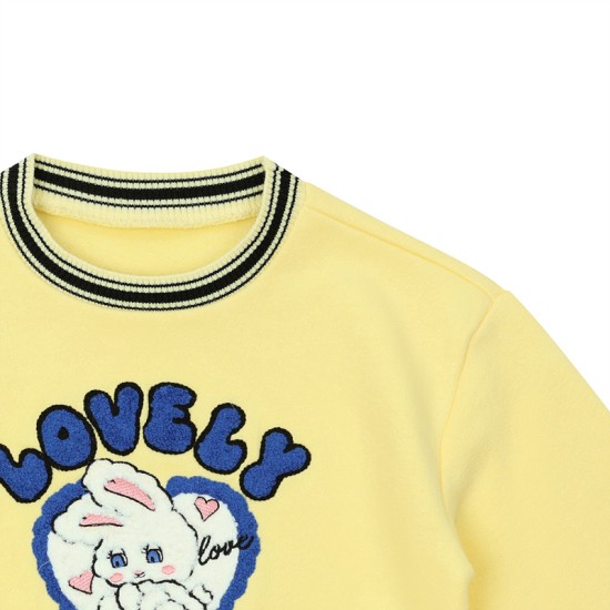 상세설명-상큼한 레몬옐로우 컬러의 맨투맨으로 가슴에 귀여운토끼부클직자수가 포인트인 아이템입니다.