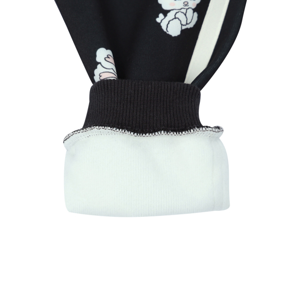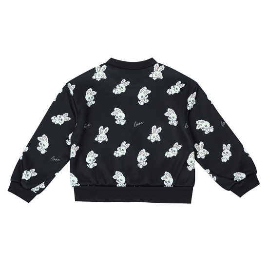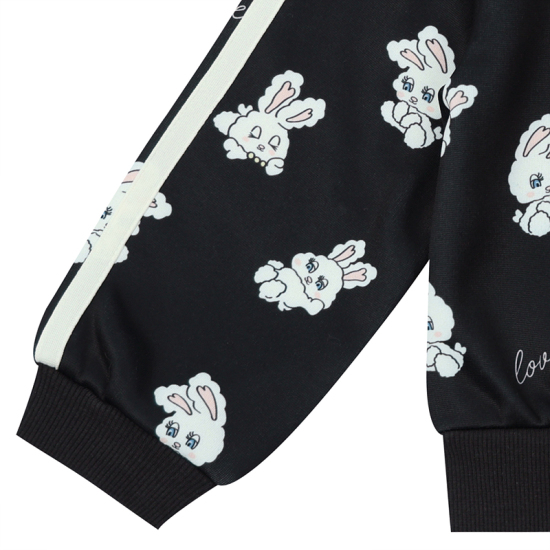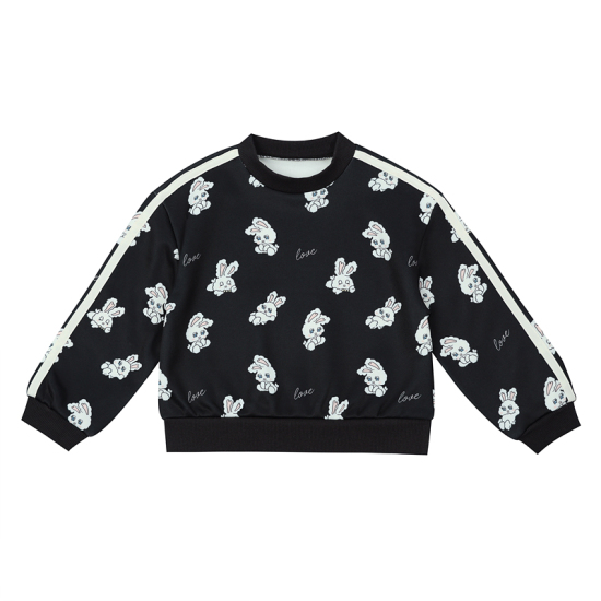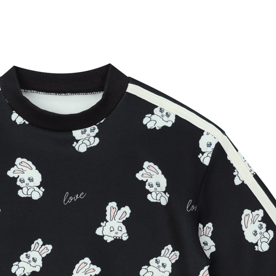 상세설명-귀여운 토끼전판패턴 나염의 맨투맨티셔츠로 소매에 테이프배색이 덧대어 귀여운 느낌을 주는 스타일입니다. T45KBP030과 SET입니다.
