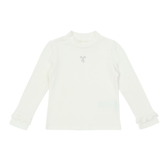 상세설명-작은 골지 기모지를 사용한 반넥 티셔츠로앞 라인에 프릴 장식과 앞 중심에 고주파 리본 핫픽스 장식으로 트렌디함 살린 스타일입니다. 기본 이너로 코디하기 좋은 아이템입니다.