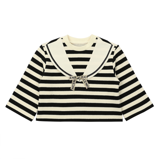상세설명-스트라이프 기모쭈리 소재 크롭티로 앞넥라인에 장식 카라가 덧대어진 스타일입니다. 짧은 기장감으로 부츠컷 팬츠나 스커트에 코디하여 연출하기 좋은 티셔츠입니다. 골드 리본 브롯치 장식이 있습니다.