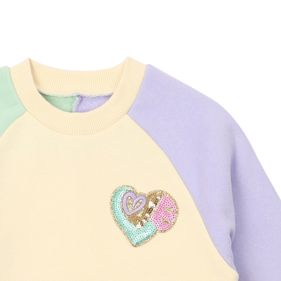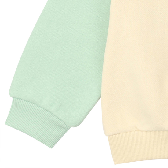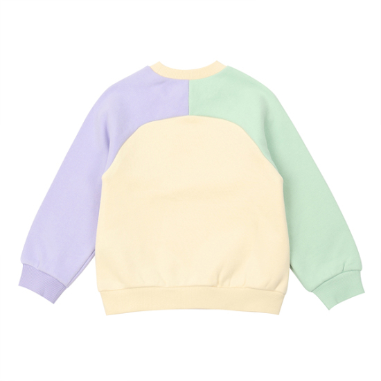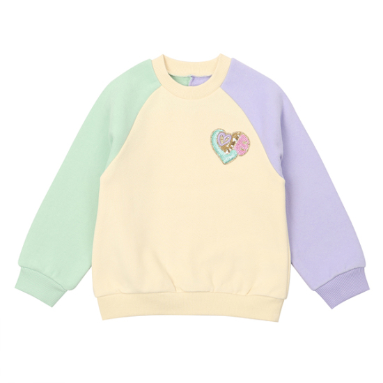 상세설명-라그란스타일의 소배배색 맨투맨으로 톡톡튀는 민트 &연보라 조합이 유니크한느낌을 주며, 가슴에 블링한 골드와펜이 포인트인 아이템입니다. (SET - T35KBP040)
