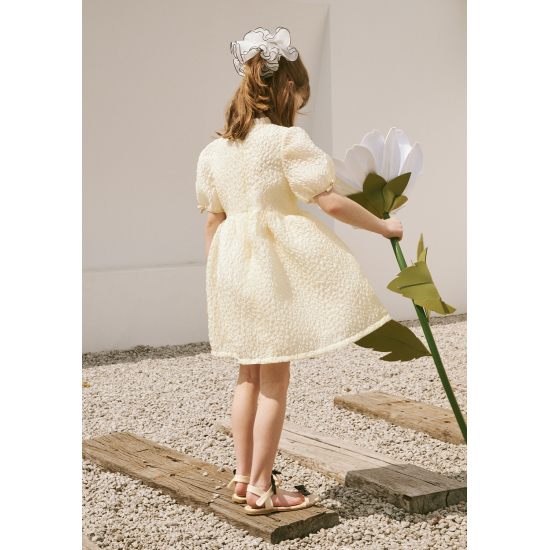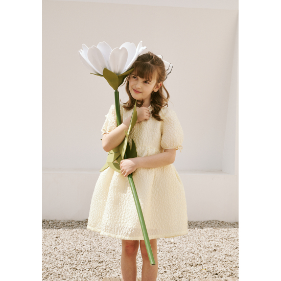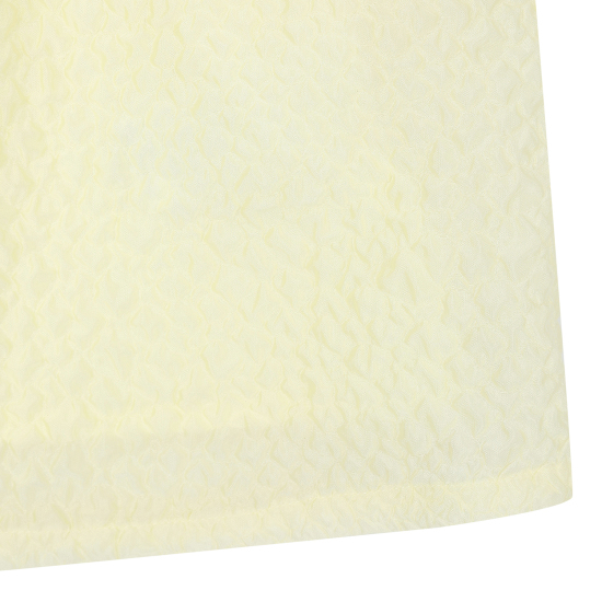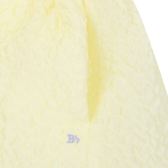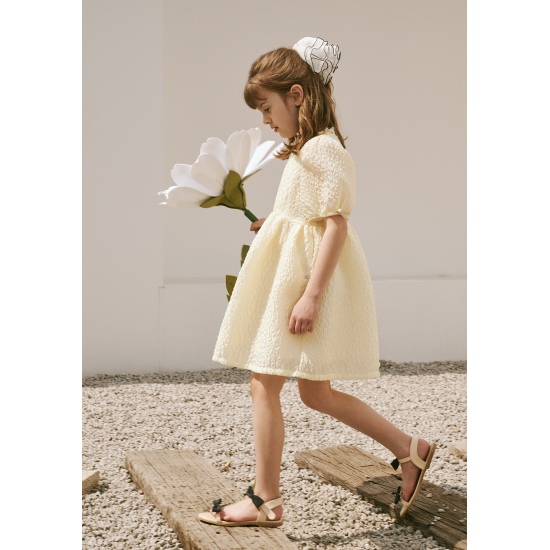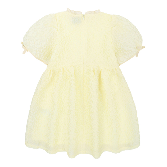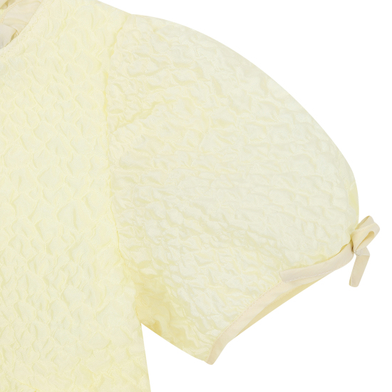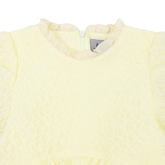 가볍고 샤이니한 자카드 소재를 사용한 여성스러운 레몬 옐로우 컬러의 원피스입니다. 화사한 분위기의 레몬 옐로우 컬러가 사랑스러움을 더해주며, 광택감이 있는 다른 소재의 프릴 카라 디테일과 작은 리본 디테일이 포인트가 되는 아이템입니다. 적당한 볼륨감이 있는 디자인으로 다양한 체형 커버에도 효과적입니다.