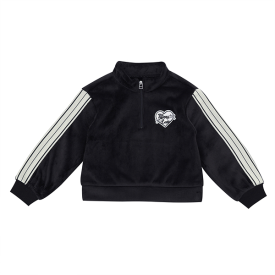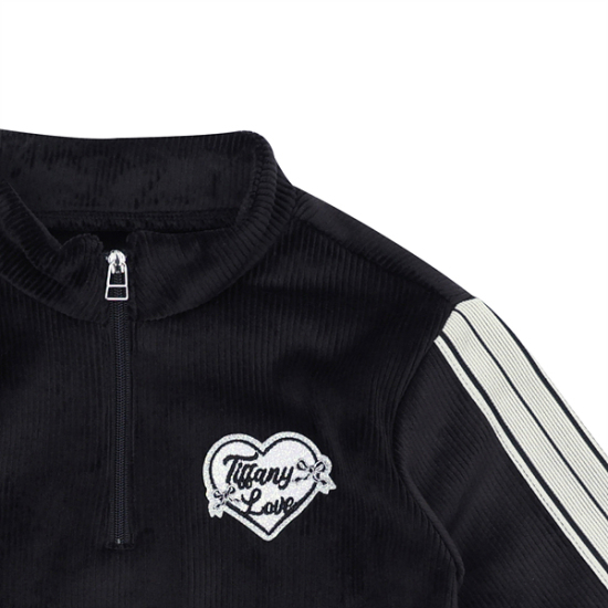 상세설명-보온성과 신축성이 좋은 벨로아 기모 소재로 디자인된 반집업 티셔츠 입니다. 왼쪽 가슴 쪽에는 하트모양의 반짝이는 자수 와펜이 있어서 귀엽고 발랄한 느낌을 줍니다.
