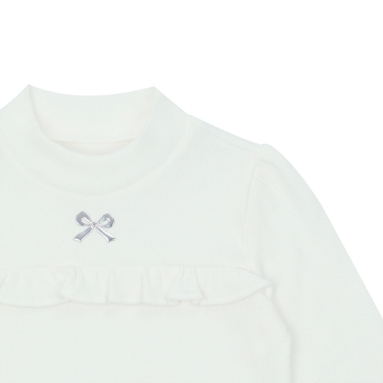 상세설명-작은 골지 기모지를 사용한 반넥 티셔츠로앞 라인에 프릴 장식과 앞 중심에 고주파 리본 핫픽스 장식으로 트렌디함 살린 스타일입니다. 기본 이너로 코디하기 좋은 아이템입니다.