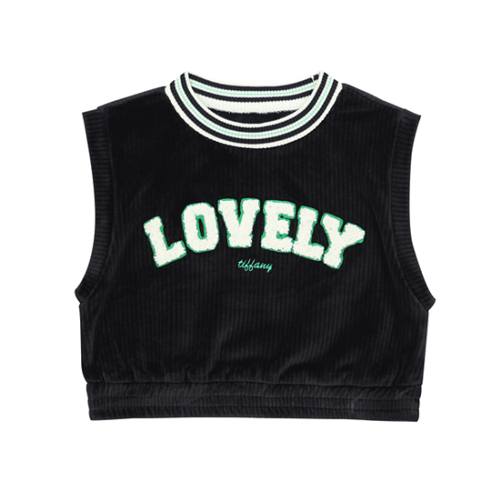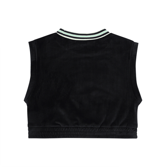 상품설명-부드러운 벨벳 골지 밍크 소재를 사용한 VEST 입니다. 앞에 로고 부클 자수와 스트라이프 넥 시보리로 약간의 스포티함도 살린 스타일입니다. SET PT ; T45KAP010