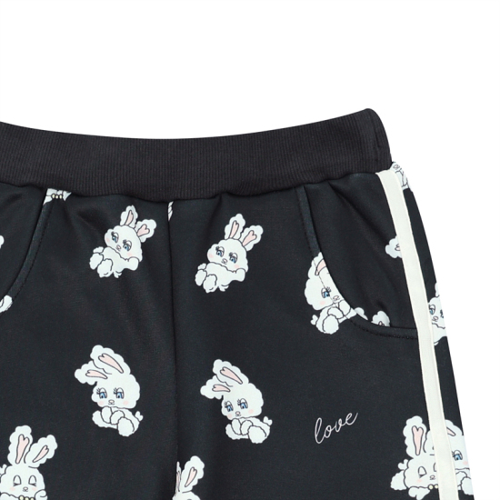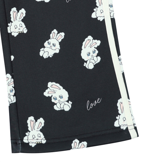 상품설명-귀여운 토끼전판패턴 나염의 블랙팬츠로 와이드판핏에 테이프배색이 덧대어 귀여운 느낌을 주는 스타일입니다. T45KBT050과 SET입니다.