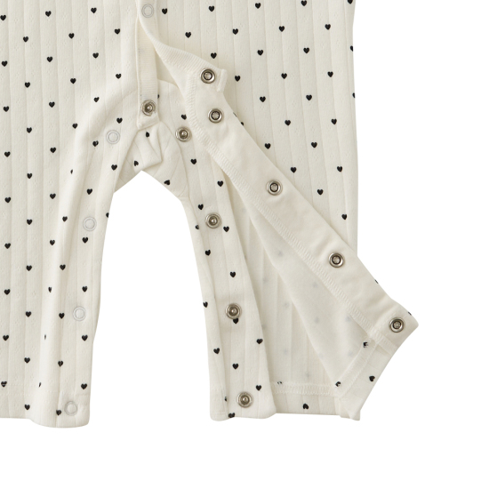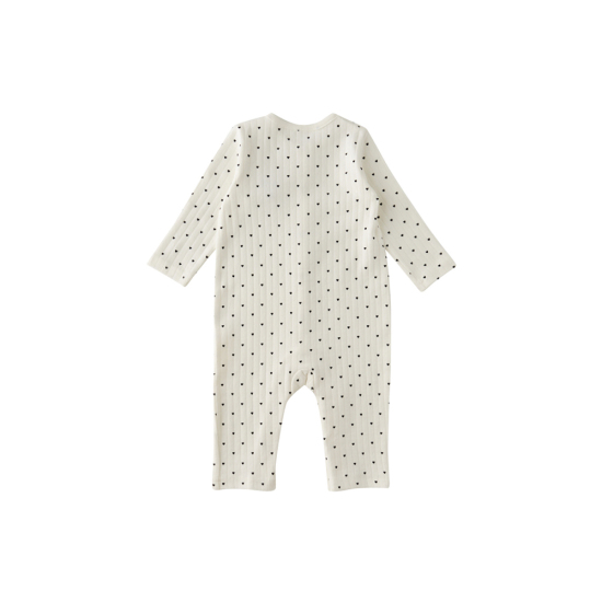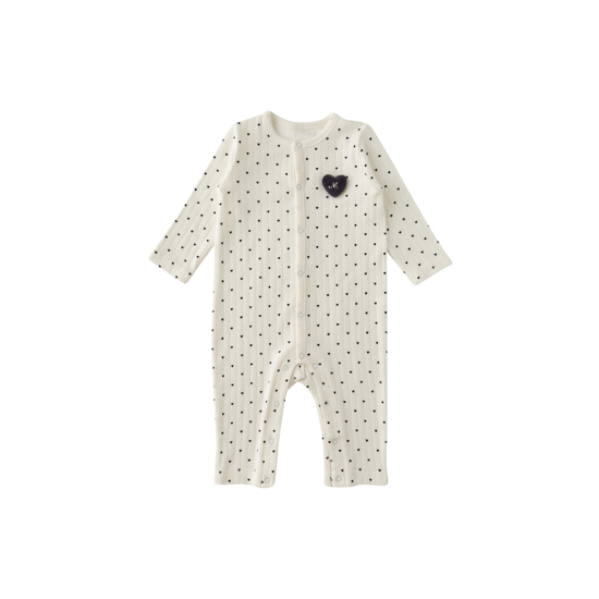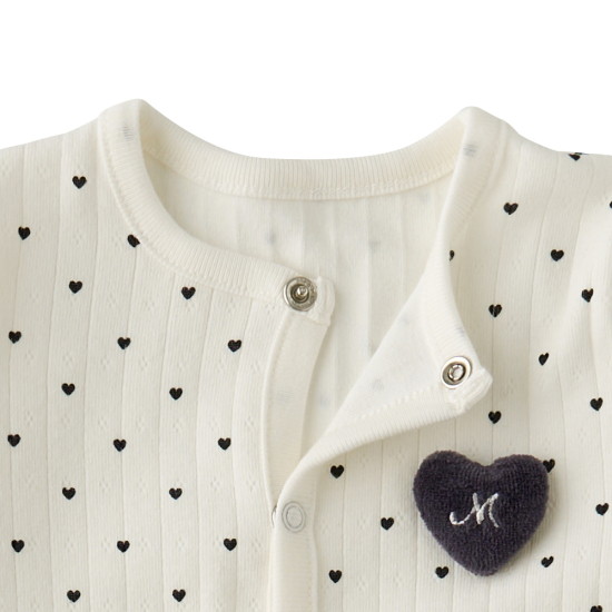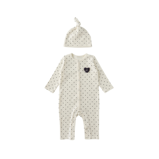 우주복+모자로 구성된 2SET아이템입니다. 일정한 무늬의 JQD 조직을 넣어 고급스러움을 더한 후라이스 스판 원단을 사용했습니다. 활동량이 많고 더위를 많이 타는 아기들에게 편안한 착용감과 탁월한 통기성을 줍니다. 패턴 우주복에 밍크뮤 하트 인형을 포인트로 매치해 선물용으로 좋은 아이템입니다.