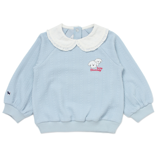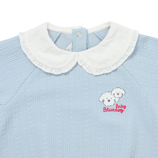 얇은 싱글 면 긴팔 티셔츠입니다. 귀여운 강아지 그래픽이 포인트로 사용되었