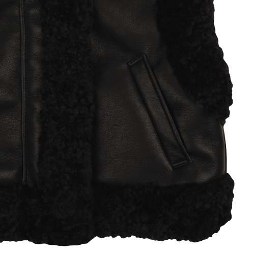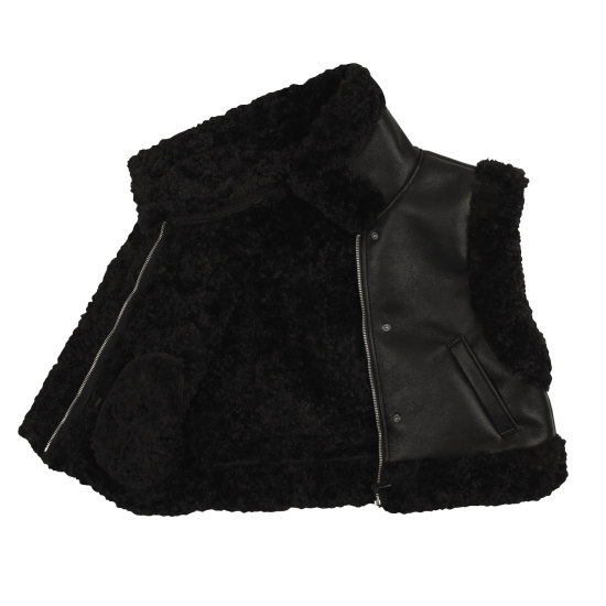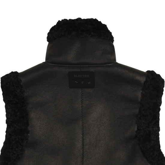 시크한 블랙 무스탕 베스트 입니다.여유있는 품과 크롭한 기장으로 제안하였습니다.뒤쪽에 유니크한 십자모양으로 지그재그 스티치 포인트를 주었습니다. 블랙컬러의 리뉴얼 된 가죽 라벨로 고급스러움을 주었습니다.