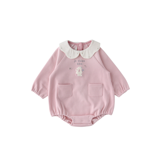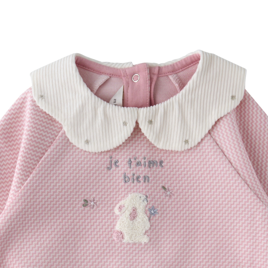 귀여운 토끼 모양 의 부클자수로 포인트를 주었으며 토끼모양의 보넷이 매력적인 바디슈트입 니다.
