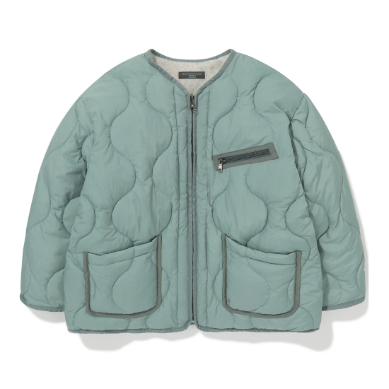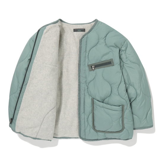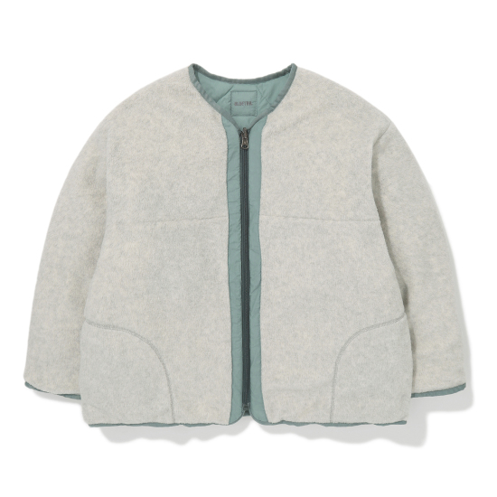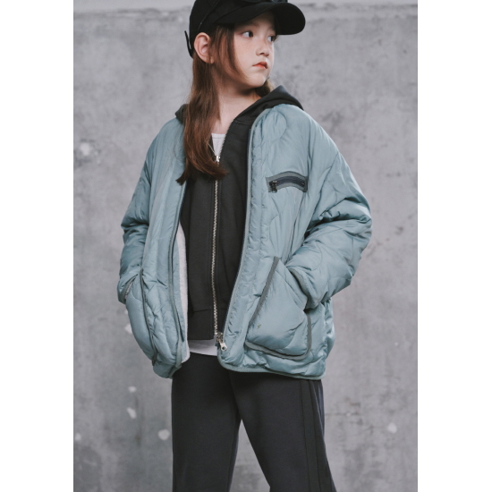 민트 컬러 퀼팅 원단과 라이트 그레이 플리스 안감으로 리버시블 점퍼입니다. 플리스쪽에 포켓을 주어 뒤집어 착용할 수 있으며, 뒷판 밑단 스냅으로 아래를 모아 귀여운 실루엣으로도 스타일링이 가능한 상품입니다. 포켓을 둘러싼 원단과 지퍼를 세련된 컬러 조합으로 포인트 주었습니다.