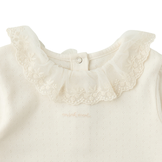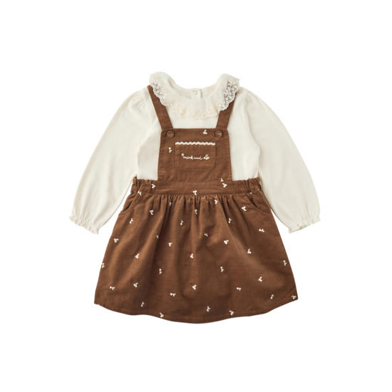 고급스러운 컬러의 아일렛 티셔츠와 소프트한 브라운 컬러의 코듀로이 소재로 아이보리 컬러 체리 자수 패턴이 포인트인 트렌디한 세트 아이템입니다.