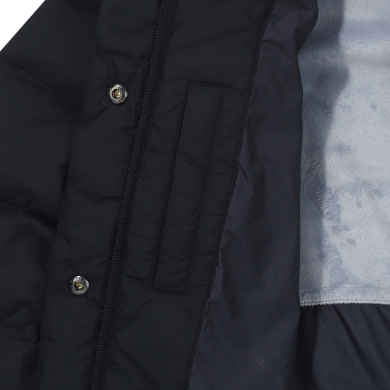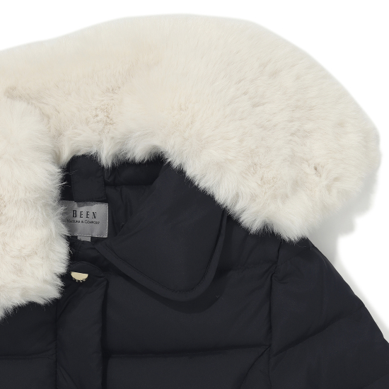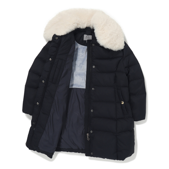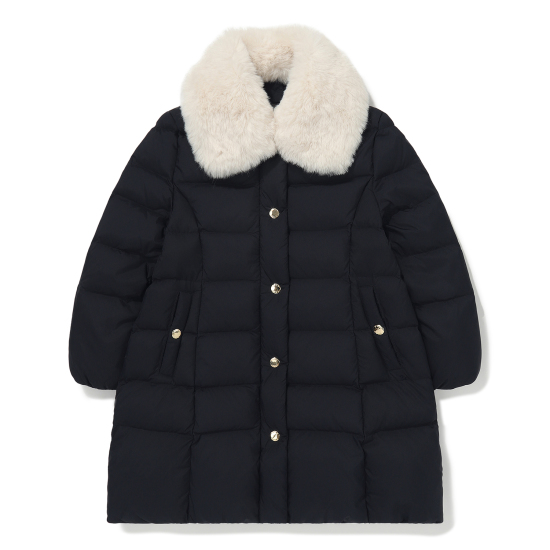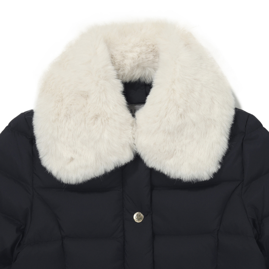 선명한 네이비 컬러로 미니멀한 라인을 살린 다운 점퍼입니다. 반짝이는고급스러움을 더해주는 골드 스냅을 모두 닫아 입어 코트처럼 연출할 수 있으며, 이너로 원피스 또는 티셔츠와 쫄바지로 쉽게 코디하여도 고급스러운 스타일링으로 연출할 수 있습니다. 탈부착이 가능한 인조퍼 카라로 화사한 분위기를 더해주었으며, 퍼카라가 없이도 볼륨감 있는 카라 디자인으로 간절기까지 입을 수 있는 아이템입니다.