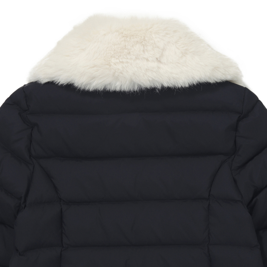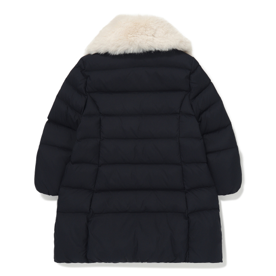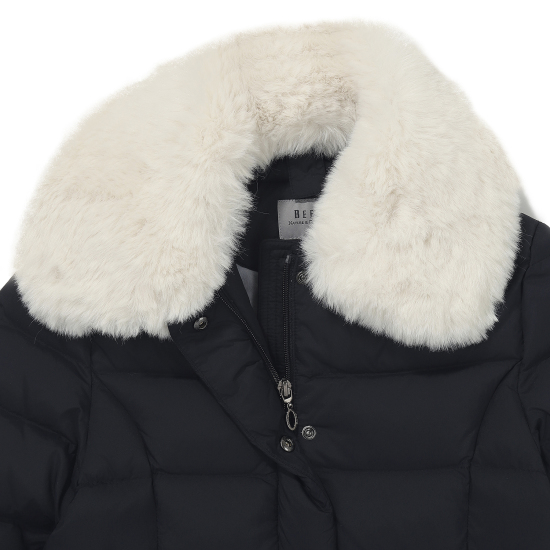 선명한 네이비 컬러로 미니멀한 라인을 살린 다운 점퍼입니다. 반짝이는고급스러움을 더해주는 골드 스냅을 모두 닫아 입어 코트처럼 연출할 수 있으며, 이너로 원피스 또는 티셔츠와 쫄바지로 쉽게 코디하여도 고급스러운 스타일링으로 연출할 수 있습니다. 탈부착이 가능한 인조퍼 카라로 화사한 분위기를 더해주었으며, 퍼카라가 없이도 볼륨감 있는 카라 디자인으로 간절기까지 입을 수 있는 아이템입니다.