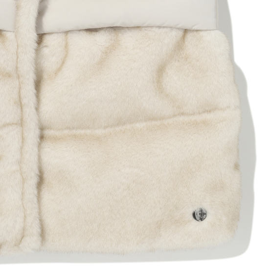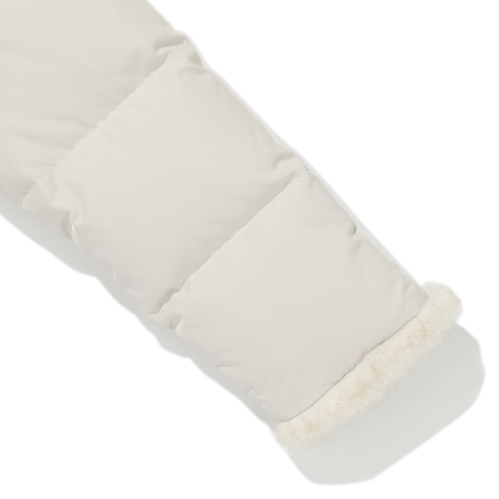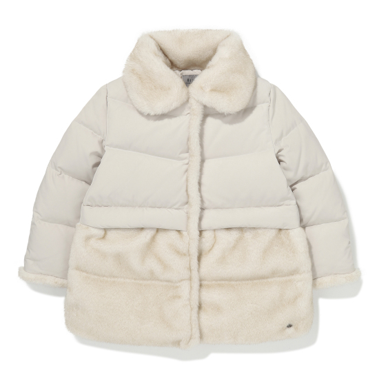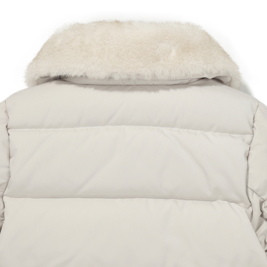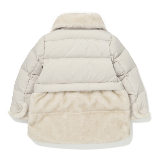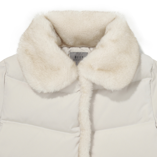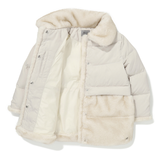 은은하고 화사한 분위기를 보여주는 아이보리 컬러의 고급스러운 이미지를 연출해주는 다운 점퍼입니다. 투톤의 리얼같은 럭셔리한 분위기를 보여주는 인조퍼를 배색하여 부드럽고 따뜻한 촉감을 더해준 디자인이 포인트입니다. 허리 안쪽의 스트링을 조절하여 다양한 실루엣으로 연출할 수 있으며, 퍼카라와 소매 끝 퍼 배색이 고급스러운 디테일로 포인트가 될 수 있는 아이템입니다.