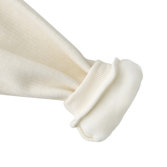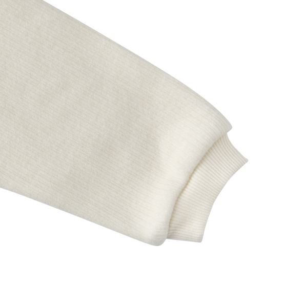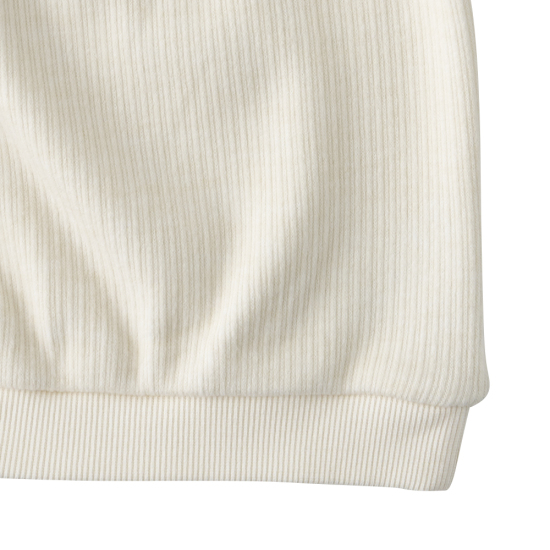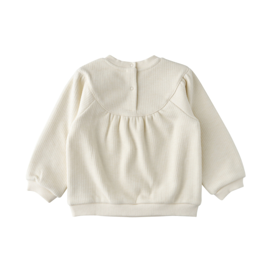 소프트한 크림 컬러의 변형 골지 맨투맨입니다. 고급스러운 골드 파이핑과 체리 자 수로 포인트를 주어 러블리한 느낌을 더해주었으며, 퓨어와이드골팬츠와 세트로 연출이 가능한 아이템입니다.