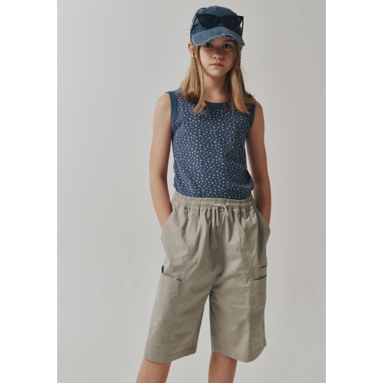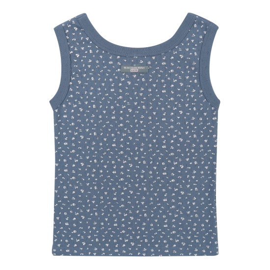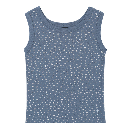 블루 컬러로 제안한 플라워 프린팅 슬리브리스입니다. 단독으로 입어도 부담스럽지 않은 안정적인 어깨 넓이와 암홀 라인을 제안하였고 레이어드에도 용이합니다. 도마뱀 자수와 라벨로 컬러 포인트를 주었습니다.