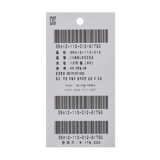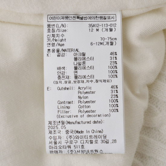 소 재.......겉감-아크릴46%,폴리에스터31%,나일론23% / 안감-면100% / 배색-폴리에스터100% / 충전재-폴 리에스터100%