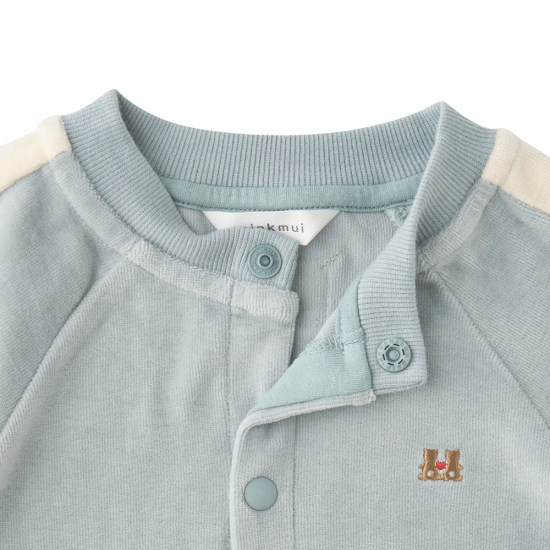 민트 컬러 몸판에 크림 컬 러 절개 배색을 주어 캐주얼한 무드를 내며, 아미띠에뮤 자수 로 포인트를 주었습니다.
