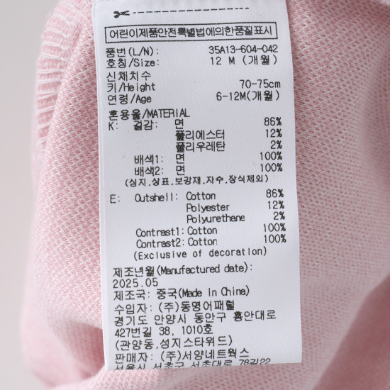 소 재......[우주복:겉감-면86%,폴리에스터12%,폴리우레탄2% / 배 색1-면100% / 배색2-면100%] [보넷:겉감-면100% / 안 감-면100% / 배색-면100%]